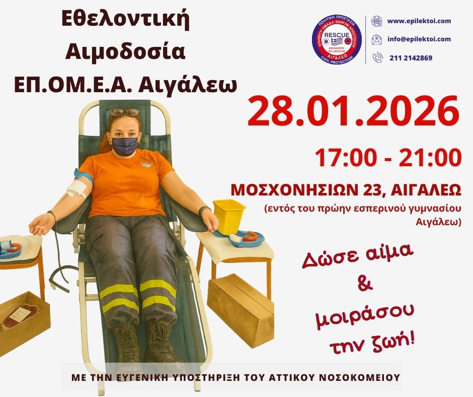 Η ΕΠ.ΟΜ.Ε.Α. Αιγάλεω διοργανώνει εθελοντική αιμοδοσία και καλεί όλους τους πολίτες να συμμετέχουν σε μια πράξη ανθρωπιάς και αλληλεγγύης που σώζει ζωές.